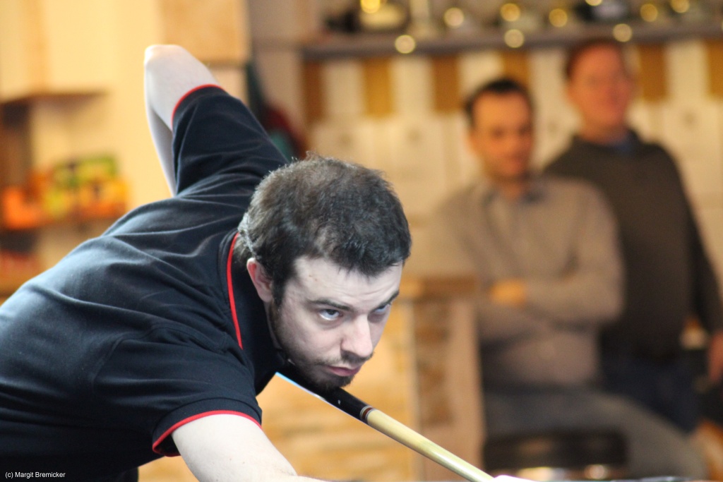 Jan und Thomas lieferten sich ein ausgeglichenes Spiel. Ab Mitte des Satzes war Jan allerdings stets 15 bis 20 Bälle vorn. Diese Führung rettete er trotz einiger sehenswerter Bälle seines Gegenüber ins Ziel und gewann mit 125-111.