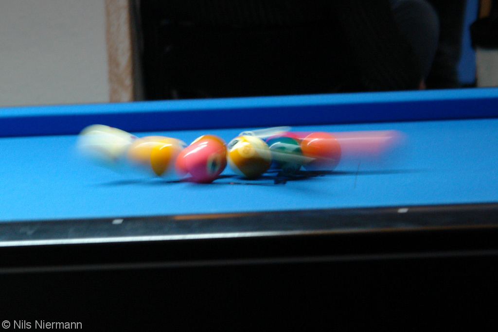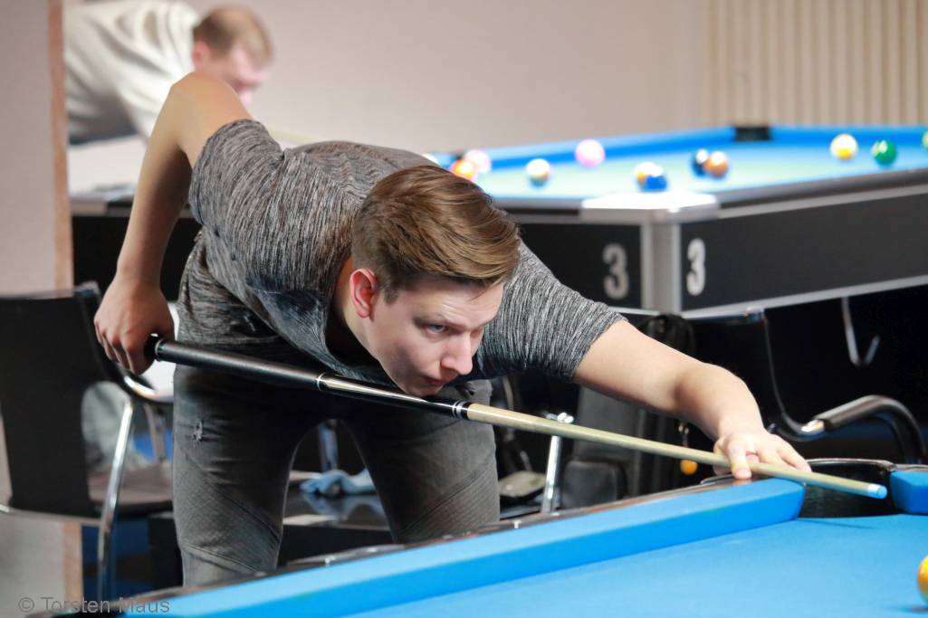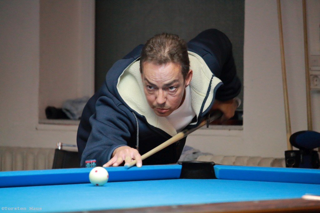 Und auch das Spiel zwischen Fynn Kremer und Ilya Bertsun bot Spannung pur. Das Spiel gegen schließlich an Fynn – aus Ilyas Sicht unnötiger Weise. Und auch der Spieler, der das Turnier in den vergangen Jahren maßgeblich geprägt hat und das allem Anschein nach auch im Jahr 2016 wieder vorhat, zeigte sich sportlich nicht von seiner Schokoladenseite. Gegen Daniel Jadanec (BC Colours Düsseldorf) unterliefen dem Bundesligaspieler so einige Fehler mit Seltenheitswert. Daniel dagegen spielte überlegt, ruhig und konsequent. SO kam es zu einer 3-1 Führung für den Düsseldorfer. Doch als er die Chance bekam den verdienten Sieg einzutüten, war es vorbei mit dem sicheren Spiel. Erst verkratzte er eine Sieben und zum Schuss auch noch eine, zugegebenermaßen nicht ganz einfache Acht. Und bei den letzten beiden Bällen blitzte dann wieder die Klasse Klaudios auf. Acht gesenkt, Stellung nicht optimal, aber auch die Neun landete mit einem Donnerhall – das waren die Felsbrocken, die Klaudio vom Herzen fielen – in der Tasche. Daniel hatte sich also für seine gute Leistung nicht belohnen können.
