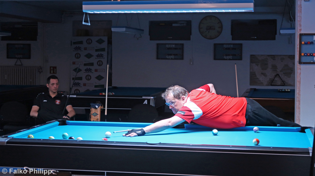 Harald hatte im 14.1e einen klasse Start hingelegt und führt nach 5 Aufnahmen bereits mit 71 zu -2. Danach erlaubte sich der Oldie eine Schwächephase, brachte das Spiel aber dennoch ungefährdet mit 125-77 nach Hause.