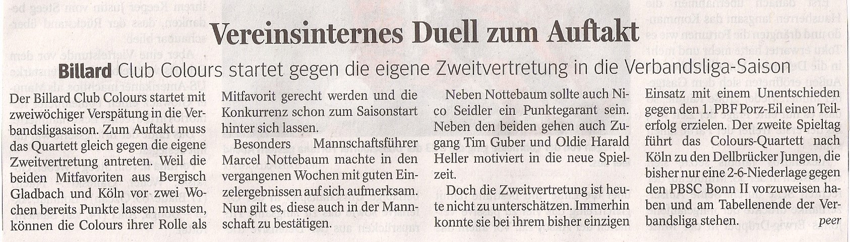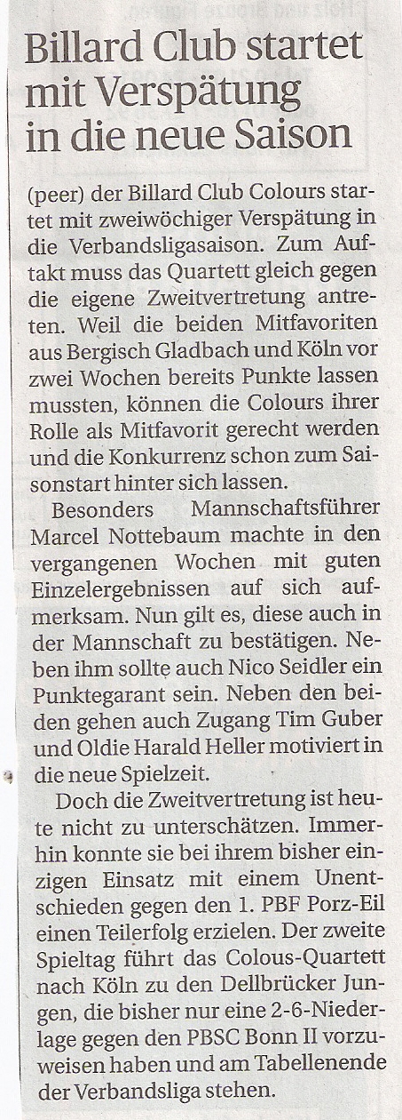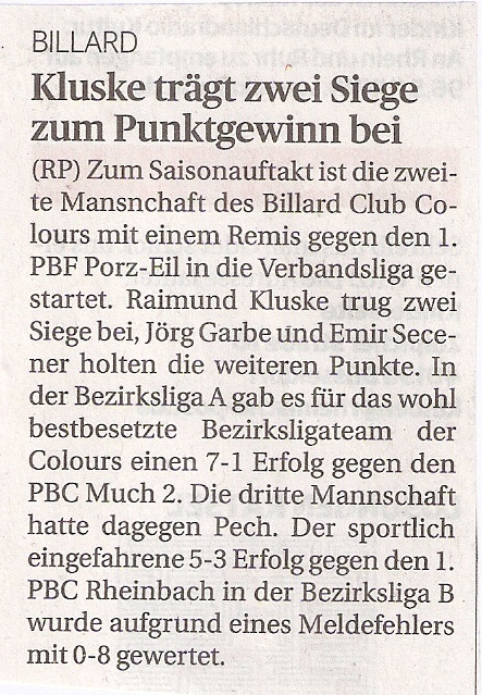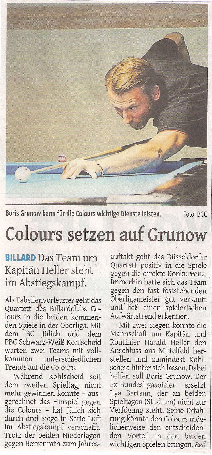 Billard: BC Colours startet mit Sieg und Niederlage - Rheinische Post 20.01.2016