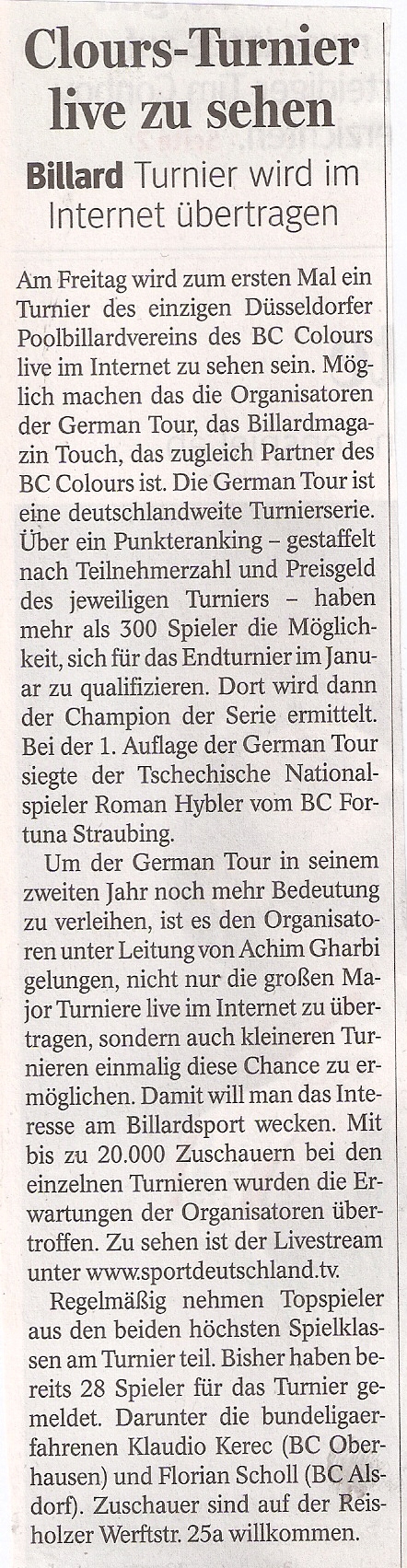 BC Colours lädt ein zu "Deutschland spielt Billard" - Rheinische Post 28.04.2016