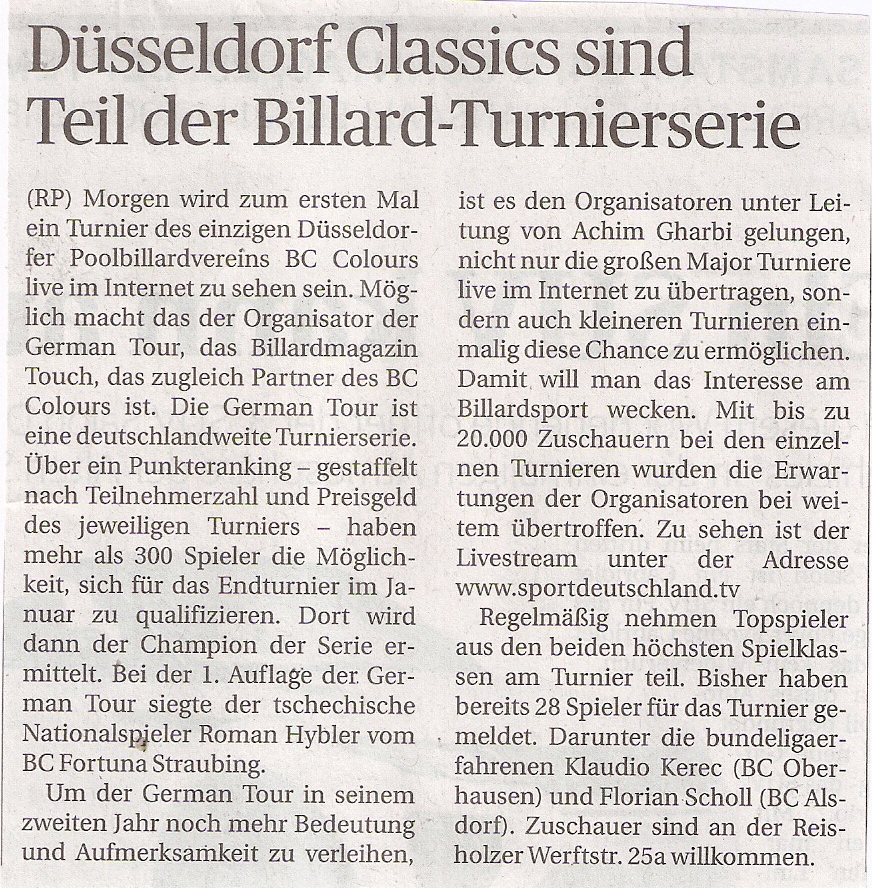 Düsseldorf Classics sind Teil der Billard-Turnierserie - Rheinische Post 22.09.2016