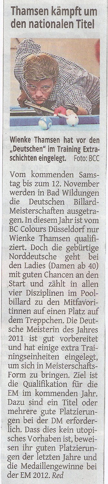 Wienke Thamsen fährt zu den Billard-Meisterschaften - Rheinische Post 05.11.2016